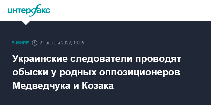 Москва. 27 апреля. INTERFAX.RU - Во Львове и Львовской области сотрудники украинского Государственного бюро расследований (ГБР) проводят обыски у родственников народного депутата Виктора Медведчука и экс-депутата Тараса Козака, сообщает ГБР.