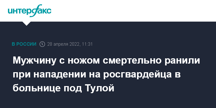 Москва. 28 апреля. INTERFAX.RU - Сотрудники правоохранительных органов применили оружие при попытке обезвредить мужчину с ножом в больнице под Тулой, сообщила в четверг пресс-служба регионального управления Росгвардии.