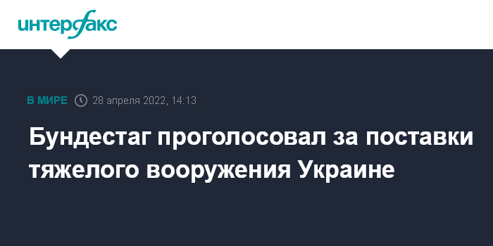 Москва. 28 апреля. INTERFAX.RU - Немецкий парламент в четверг большинством проголосовал за поставки тяжелого вооружения Украине.
