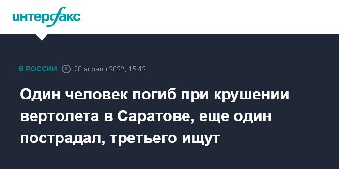 Москва. 28 апреля. INTERFAX.RU - Один человек погиб при катастрофе вертолета в Саратове в четверг, еще один получил травмы, продолжается поиск третьего пострадавшего, сообщил министр здравоохранения Саратовской области Олег Костин в своем телеграм-канале.