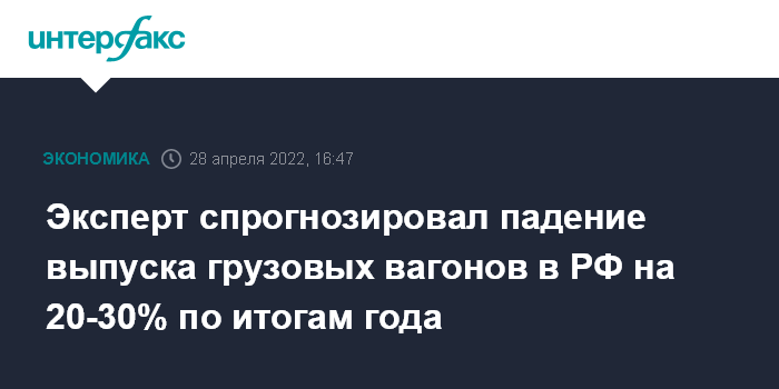 Москва. 28 апреля. INTERFAX.RU - Институт проблем естественных монополий (ИПЕМ) прогнозирует падение выпуска грузовых вагонов в РФ на 20-30% по итогам года.