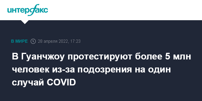 Москва. 28 апреля. INTERFAX.RU - Власти города Гуанчжоу (провинция Гуандун) на юге КНР начали тестировать 5,6 млн человек на возможное наличие COVID-19 после того, как в местном аэропорту, предположительно, обнаружили один случай коронавируса, сообщил телеканал Channel NewsAsia.
