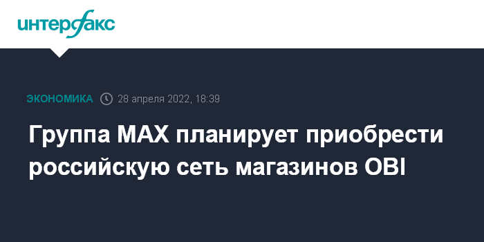 Москва. 28 апреля. INTERFAX.RU - "Группа инвестиционно-строительных компаний MAX" планирует приобрести российскую сеть DIY-магазинов, принадлежавших немецкой компании OBI, сообщила Федеральная антимонопольная служба.
