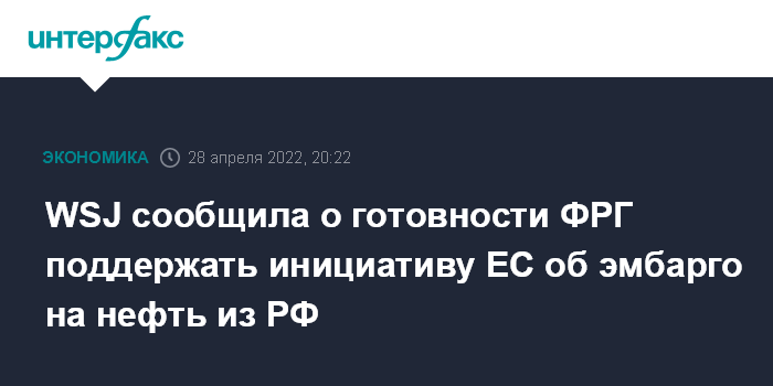 Москва. 28 апреля. INTERFAX.RU - Германия готова поддержать инициативу Евросоюза о введении эмбарго на импорт нефти из России, пишет The Wall Street Journal со ссылкой на немецких чиновников.