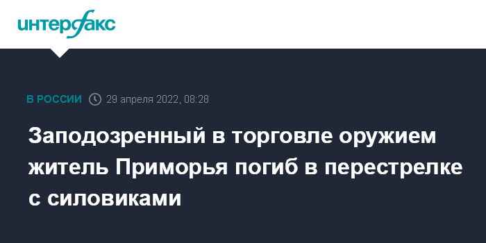 Москва. 29 апреля. INTERFAX.RU - Житель Приморского края, которого подозревали в незаконном обороте оружия, погиб во Владивостоке в ходе перестрелки с сотрудниками спецслужб, сообщил "Интерфаксу" информированный источник.