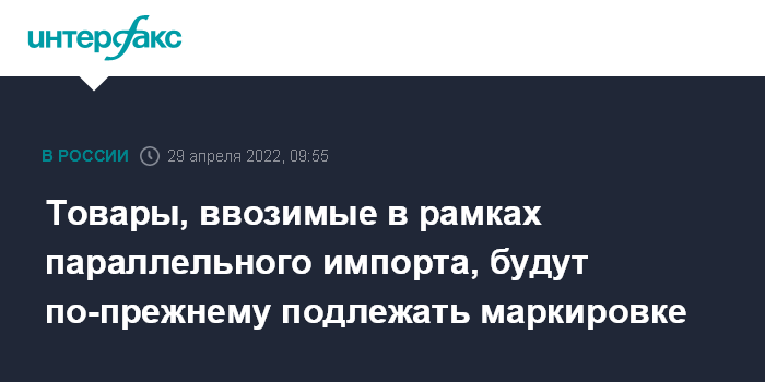 Москва. 29 апреля. INTERFAX.RU - Легализация "параллельного импорта" (ввоз в страну товаров без разрешения правообладателя) не отменяет необходимости нанесения цифровой маркировки на эти товары, заявили в Минпромторге РФ.