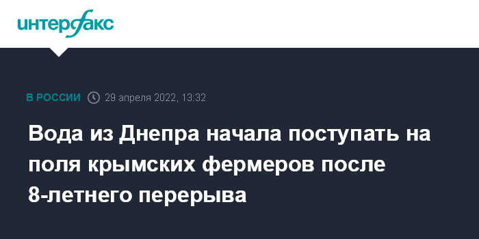 Москва. 29 апреля. INTERFAX.RU - Днепровская вода из Северо-Крымского канала запущена на поля сельхозпроизводителей на севере полуострова Крым после восьмилетнего перерыва, вызванного блокадой со стороны Украины, сообщил глава республики Сергей Аксенов в пятницу.