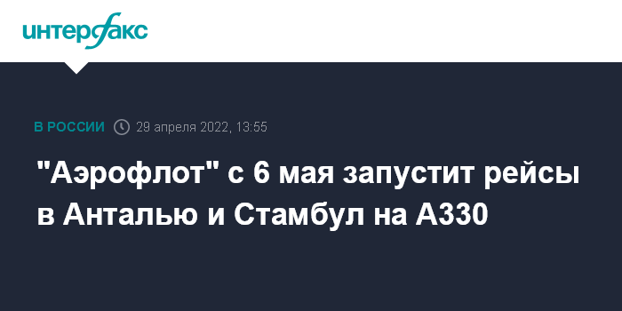 Москва. 29 апреля. INTERFAX.RU - "Аэрофлот" c 6 мая возобновляет регулярные рейсы в Анталью и Стамбул, говорится в сообщении компании.