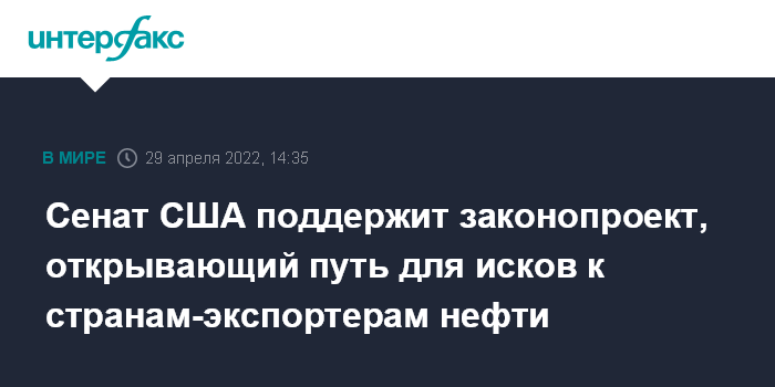 Москва. 29 апреля. INTERFAX.RU - Члены комитета Сената США по юридическим делам, скорее всего, на следующей неделе проголосуют за одобрение законопроекта, открывающего возможность для исков Вашингтона против стран-экспортеров нефти, сообщают американские СМИ.