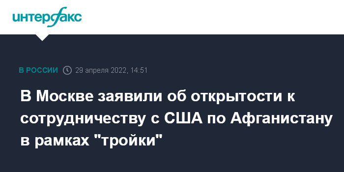 Москва. 29 апреля. INTERFAX.RU - В Москве открыты для сотрудничества с Вашингтоном по Афганистану в рамках "тройки", но призывают США разморозить активы афганского центрального банка, заявил глава МИД РФ Сергей Лавров.
