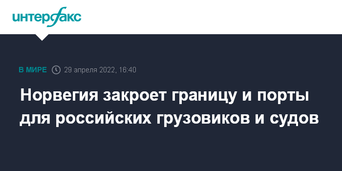 Москва. 29 апреля. INTERFAX.RU - Российские корабли не смогут заходить в порты Норвегии, также страна закроет границу для грузовых автомобилей из РФ, сообщают в пятницу европейские СМИ со ссылкой на норвежский МИД.