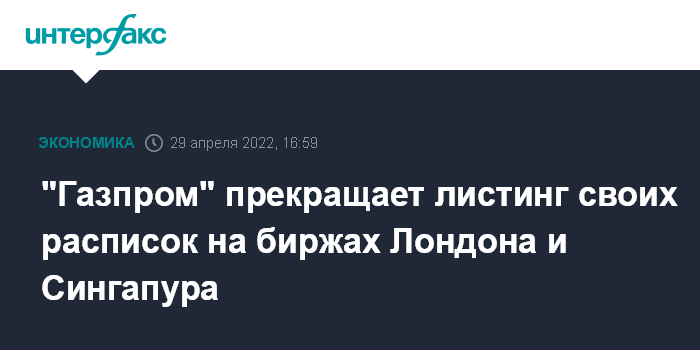 В связи с принятием соответствующего закона "Газпром" уведомил 29 апреля 2022 года Управление финансового надзора Великобритании о намерении отменить стандартный листинг депозитарных расписок на Лондонской фондовой бирже. Компания также направила заявления на Лондонскую и Сингапурскую фондовые биржи о делистинге не позднее чем через 20 рабочих дней.