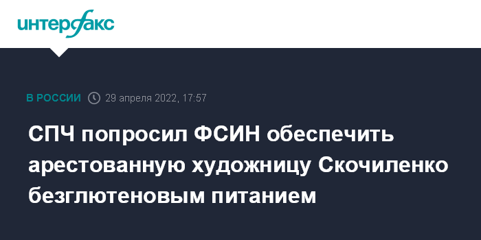 Москва. 29 апреля. INTERFAX.RU - Председатель Совета при президенте РФ по развитию гражданского общества и правам человека (СПЧ) Валерий Фадеев обратился к директору Федеральной службы исполнения наказаний (ФСИН) Аркадию Гостеву с просьбой обеспечить необходимым безглютеновым питанием художницу Александру Скочиленко в СИЗО-5 Петербурга, сообщила в пятницу пресс-служба СПЧ.