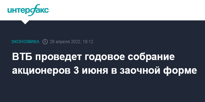 Москва. 29 апреля. INTERFAX.RU - Годовое собрание акционеров ВТБ пройдет в заочном формате 3 июня, говорится в материалах по итогам наблюдательного совета госбанка.