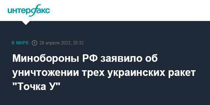 Москва. 29 апреля. INTERFAX.RU - Российские средства ПВО сбили шесть украинских беспилотников и три ракеты "Точка-У", заявили в Минобороны РФ.