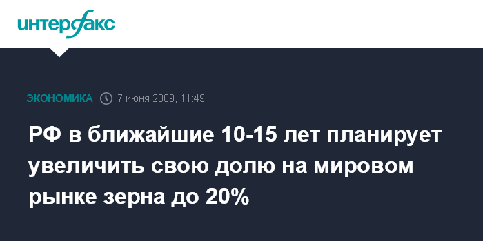 Санкт-Петербург. 7 июня. INTERFAX.RU - Россия в ближайшие 10-15 лет планирует увеличить свою долю на мировом рынке зерна до 20%.