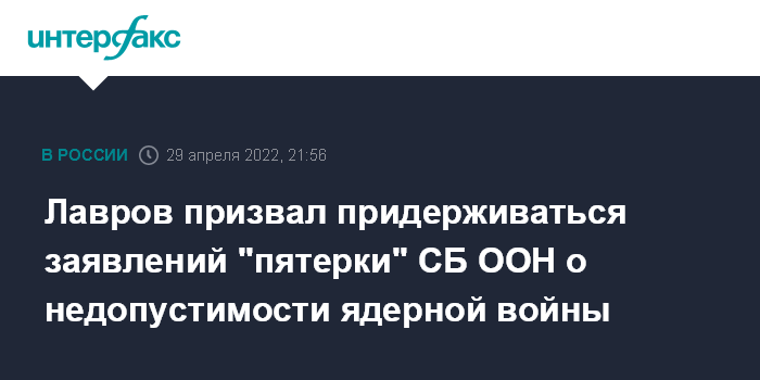 Москва. 29 апреля. INTERFAX.RU - Глава МИД РФ Сергей Лавров заявил о необходимости придерживаться заявлений постоянных членов СБ ООН о недопустимости ядерной войны.