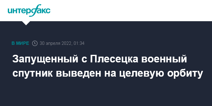 Москва. 30 апреля. INTERFAX.RU - Запущенный в интересах военного ведомства с космодрома Плесецк в Архангельской области легкой ракетой "Ангара-1.2" спутник выведен на целевую орбиту, сообщили журналистам в Минобороны РФ.