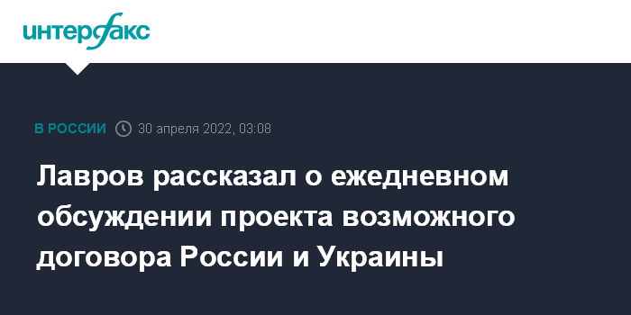 Москва. 30 апреля. INTERFAX.RU - Москва и Киев в ежедневном режиме по видеоконференцсвязи обсуждают проект возможного договора, российская сторона выступает за продолжение переговорного процесса, заявил глава МИД РФ Сергей Лавров.