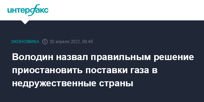 Москва. 30 апреля. INTERFAX.RU - Председатель Госдумы Вячеслав Володин назвал правильным решение приостановить поставки газа в недружественные страны.