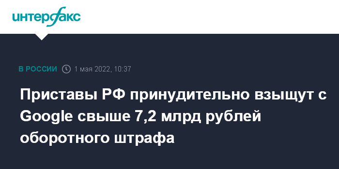Москва. 1 мая. INTERFAX.RU - Российские приставы завели в отношении компании Google дело о принудительном взыскании оборотного штрафа в 7,2 млрд рублей за неоднократный отказ удалить запрещенный в РФ контент.