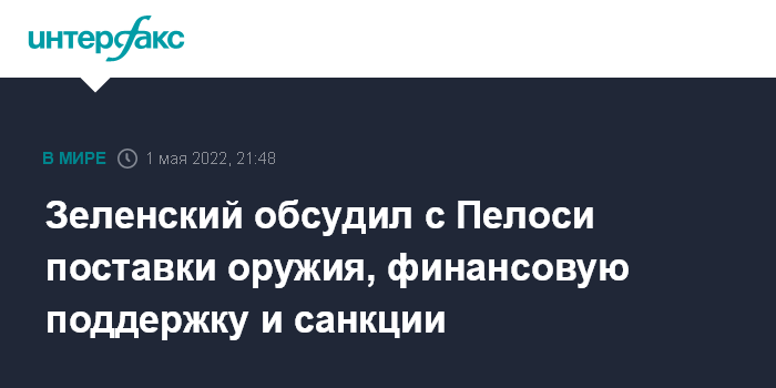 Москва. 1 мая. INTERFAX.RU - Президент Украины Владимир Зеленский назвал состоявшиеся переговоры со спикером Палаты представителей США Нэнси Пелоси предметными, стороны обсудили оборонные поставки в рамках программы ленд-лиза, макрофинансовую поддержку и санкции против России.