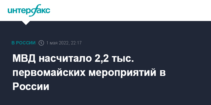 "В более 1600 населенных пунктах РФ состоялось свыше 2,2 тыс. мероприятий, посвященных празднованию 1 мая. Существенных правонарушений не допущено", - сообщила журналистам в воскресенье официальный представитель МВД России Ирина Волк.