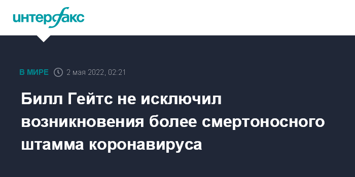 "Эта пандемия все еще угрожает нам появлением варианта (коронавируса - ИФ), который будет еще более заразным и еще более фатальным. Это маловероятно, я не хочу быть голосом обреченности и мрака, но вероятность того, что эта пандемия, (что) мы еще не видели худшего, намного превышает пятипроцентный риск", - заявил Гейтс.