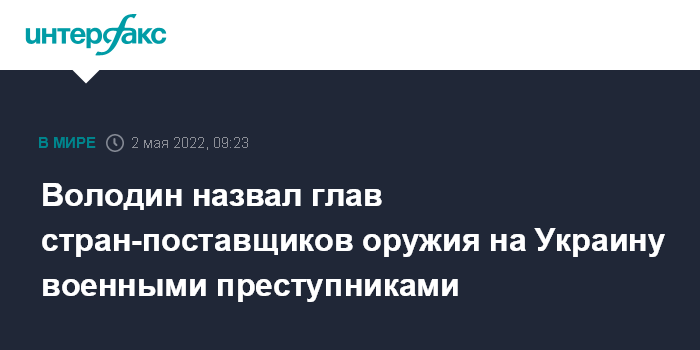 Москва. 2 мая. INTERFAX.RU - Руководители государств, принявших решение о поставках оружия на Украину, должны быть привлечены к ответственности как военные преступники, заявил председатель Госдумы Вячеслав Володин.