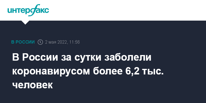 Москва. 2 мая. INTERFAX.RU - Суточный прирост новых заболевших коронавирусной инфекцией в РФ составил 6 207 новых случаев, следует из данных оперативного штаба, обнародованных в понедельник.