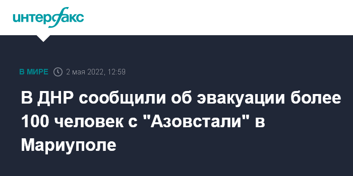 Москва. 2 мая. INTERFAX.RU - Более ста человек эвакуировали с территории комбината "Азовсталь" в Мариуполе, сообщает штаб территориальной обороны ДНР.