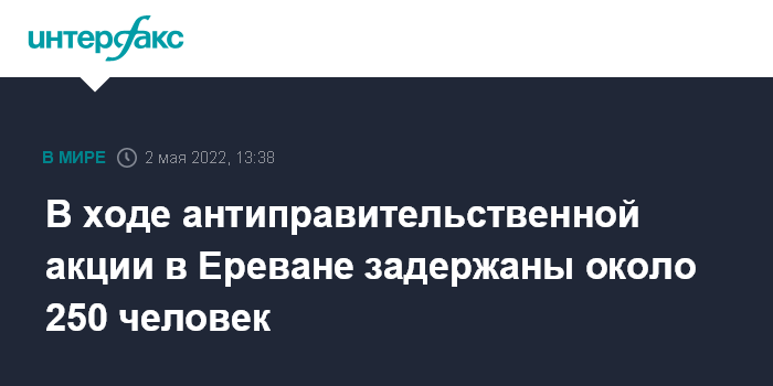 Москва. 2 мая. INTERFAX.RU - Полиция Армении в понедельник задержала почти 250 демонстрантов, перекрывающих улицы в центре Еревана в рамках объявленных оппозиций акций гражданского неповиновения.
