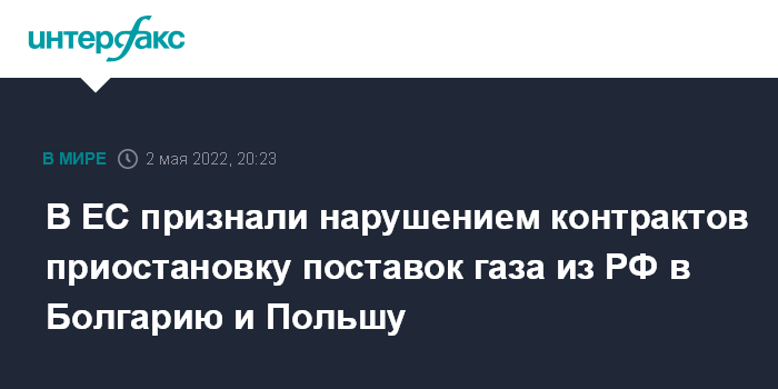 Москва. 2 мая. INTERFAX.RU - Решение России о приостановке поставок газа в Польшу и Болгарию в связи с их нежеланием переходить на оплату в рубли - нарушение контрактов, заявила министр экологических преобразований Франции Барбара Помпили по итогам встречи министров энергетики ЕС.