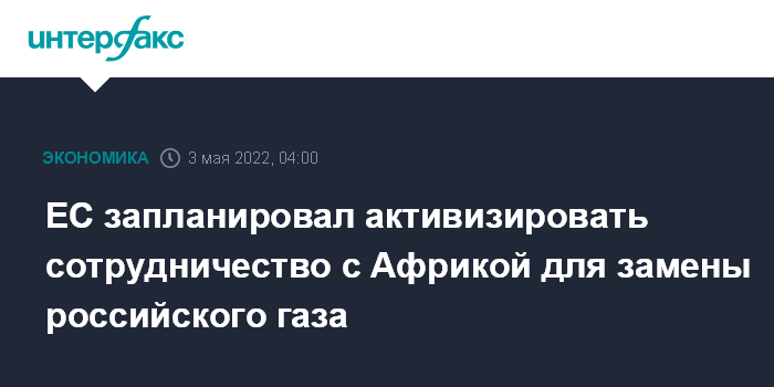 Москва. 3 мая. INTERFAX.RU - Европейский союз будет стремиться активизировать сотрудничество с африканскими странами для замещения импорта российского газа и снижения зависимости от РФ почти на две трети в текущем году, сообщило агентство Bloomberg со ссылкой на имеющийся в ее распоряжении проект документа Евросоюза.