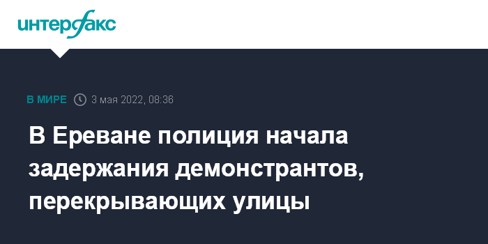 Москва. 3 мая. INTERFAX.RU - Полиция Армении проводит задержания демонстрантов, перекрывающих улицы в центре Еревана в рамках объявленных оппозицией акций гражданского неповиновения, передает корреспондент "Интерфакса".