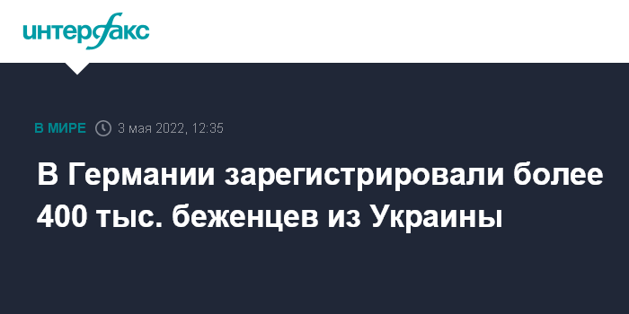 Москва. 3 мая. INTERFAX.RU - Полиция Германии зарегистрировала свыше 400 тыс. беженцев из Украины, сообщило Федеральное министерство внутренних дел.