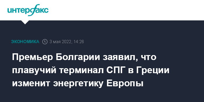 Москва. 3 мая. INTERFAX.RU - Плавучий терминал СПГ, строительство которого началось в Александруполесе на севере Греции, не только будет служить для поставок энергоресурсов, но и даст возможность внести существенные изменения в энергетику Европы, заявил во вторник премьер Болгарии Кирил Петков.