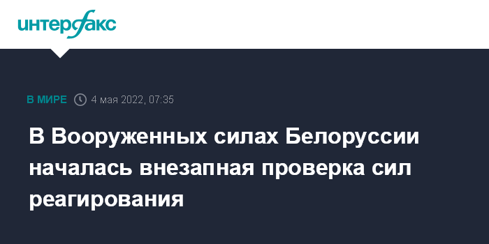Москва. 4 мая. INTERFAX.RU - В Вооруженных силах Белоруссии началась внезапная проверка сил реагирования, в ходе которой воинским частям и подразделениям предстоит отработать вопросы приведения в боевую готовность, совершения марша в назначенные районы и выполнения учебно-боевых задач, сообщили в пресс-службе Минобороны в среду.