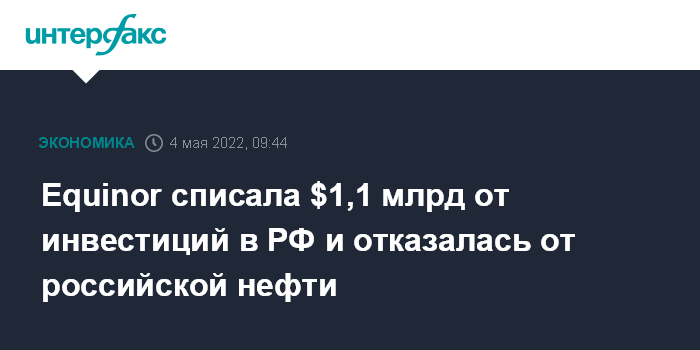 Москва. 4 мая. INTERFAX.RU - Норвежская Equinor отразила чистый убыток от списания российских активов на уровне $1,08 млрд, говорится в опубликованном отчете.