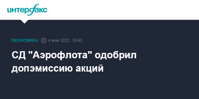 Москва. 4 мая. INTERFAX.RU - Совет директоров "Аэрофлота" одобрил допэмиссию до 5 млрд 424 млн 308 тыс. 073 обыкновенных акций номинальной стоимостью 1 руб., следует из сообщения компании по итогам заседания совета.