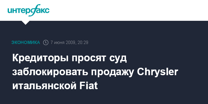Нью-Йорк. 8 июня. ИНТЕРФАКС-АФИ - Группа кредиторов обратились в Верховный суд с просьбой заблокировать продажу американского автопроизводителя Chrysler LLC, находящегося в процессе банкротства, инвесторам во главе с итальянской Fiat SpA, сообщает агентство Bloomberg.