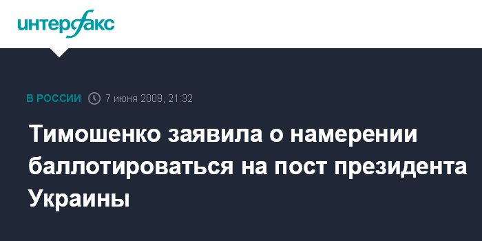 Киев. 7 июня. ИНТЕРФАКС-УКРАИНА - Премьер-министр Украины Юлия Тимошенко официально заявила о намерении баллотироваться на пост президента.