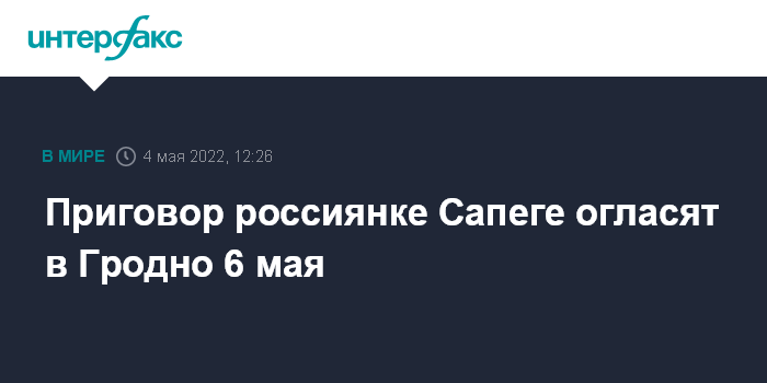 Москва. 4 мая. INTERFAX.RU - Приговор россиянке Софии Сапеге объявят 6 мая, дело гражданки России ведет Гродненский областной суд, сообщил незарегистрированный в Белоруссии правозащитный центр "Весна".