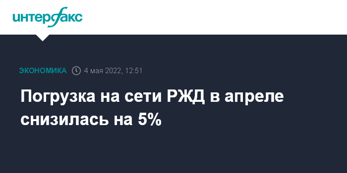 Москва. 4 мая. INTERFAX.RU - В апреле 2022 года погрузка на сети ОАО "РЖД" составила 102,4 млн тонн, что на 5% меньше, чем в апреле 2021 года, сообщила компания.