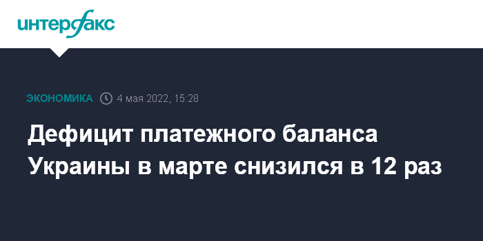 Москва. 4 мая. INTERFAX.RU - Дефицит сводного платежного баланса Украины в марте 2022 года составил $58 млн, что в 12,3 раза меньше, чем в марте 2021 года ($713 млн), сообщается на сайте Нацбанка.