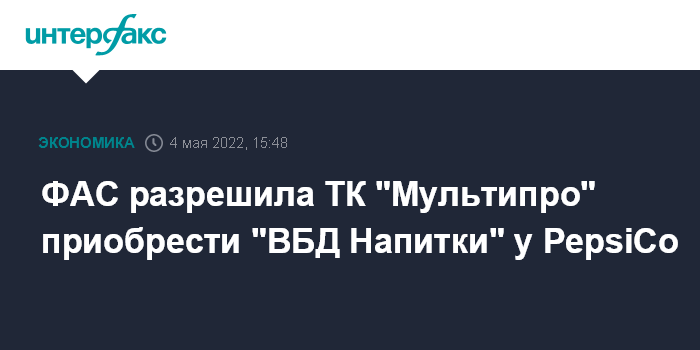 Москва. 4 мая. INTERFAX.RU - Федеральная антимонопольная служба удовлетворила ходатайство ТК "Мультипро" о приобретении "Вимм-Билль-Данн Напитки" (ее основных производственных средств и нематериальных активов).