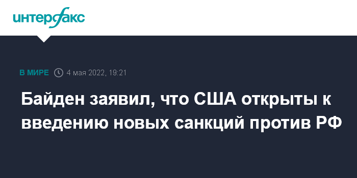 Москва. 4 мая. INTERFAX.RU - США всегда открыты к введению новых санкций против России и будут обсуждать это с партнерами по G7, сообщил американский президент Джо Байден.