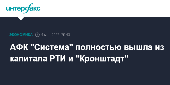 Москва. 4 мая. INTERFAX.RU - ПАО АФК "Система" полностью вышла из капитала концерна РТИ и "Кронштадт", говорится в ее заявлении, опубликованном в среду.