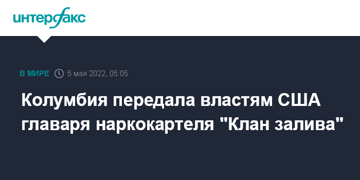 Москва. 5 мая. INTERFAX.RU - Колумбийские власти передали главаря наркокартеля "Клан залива" Антонио Усугу по прозвищу Отониэль Управлению по борьбе с наркотиками США, сообщает CNN Espanol. Эту информацию подтверждает президент Колумбии Иван Дуке.
