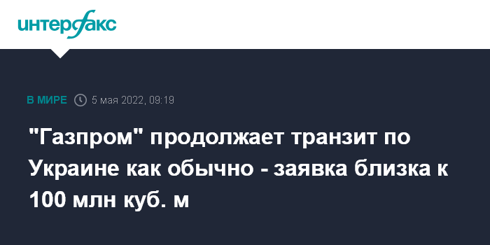 Москва. 5 мая. INTERFAX.RU - Заявки на поставку российского газа через Украину с начала мая стабилизировались на высоком уровне - почти 100 млн кубометров в сутки, что близко к объему долгосрочного бронирования украинского коридора (40 млрд кубометров в год, или 109 млн кубометров в день).